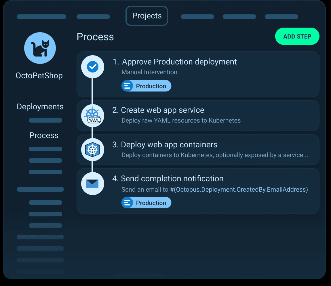 Octopus Deploy est une plateforme complète d'automatisation de l'activation qui prend en charge plusieurs langages et frameworks. Il fournit une interface web centralisée pour gérer vos processus d'installation, vous permettant de définir les étapes de mise en place, les variables et les environnements. Octopus Deploy s'intègre parfaitement aux serveurs de construction populaires et prend en charge des fonctionnalités avancées telles que le déploiement progressif et les restaurations automatiques.